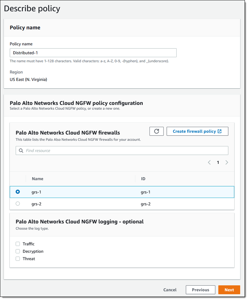 AWS Firewall Manager as well as Cloud NGFW both are regional services. My AWS Firewall Manager policy therefore is regional. Cloud NGFW currently is available in the US East Region (N. Virginia) Regions and the US West Region (N. California), with plans for expansion in the near future.