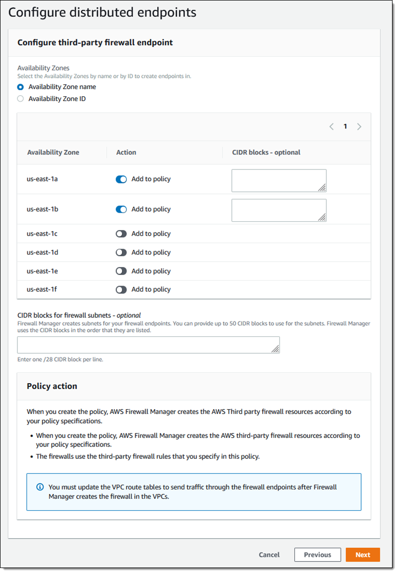 Select the availability zones where I require endpoints. You can choose to pick by name or ID. I can also designate an optional CIDR block in each AZ which will be used for subnets.