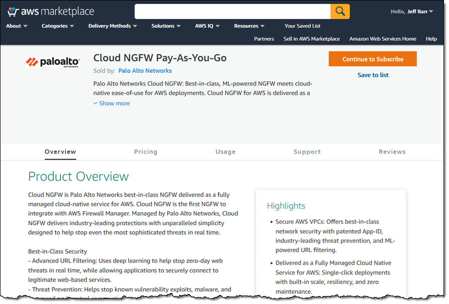 I begin by visiting the NGFW Payas-You-Go listing on AWS Marketplace. I read the terms and click Continue to Subscribe.