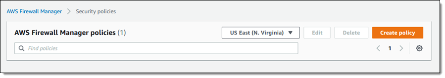 Once the NGFW tenant is associated with my account I return to the AWS Firewall Manager console and click Security policies to proceed. There are no policies yet, and I click Create policy to make one: