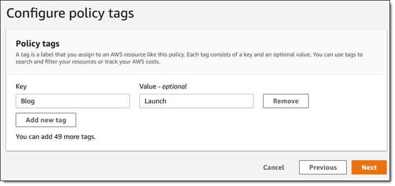 CloudFormation is used to create an IAM role for each member account. It will ask me to input the CloudNGFW account ID as well as the ExternalId parameters. Both of these parameters are accessible from the Palo Alto Networks console. You can tag your newly created policy on the next page:
